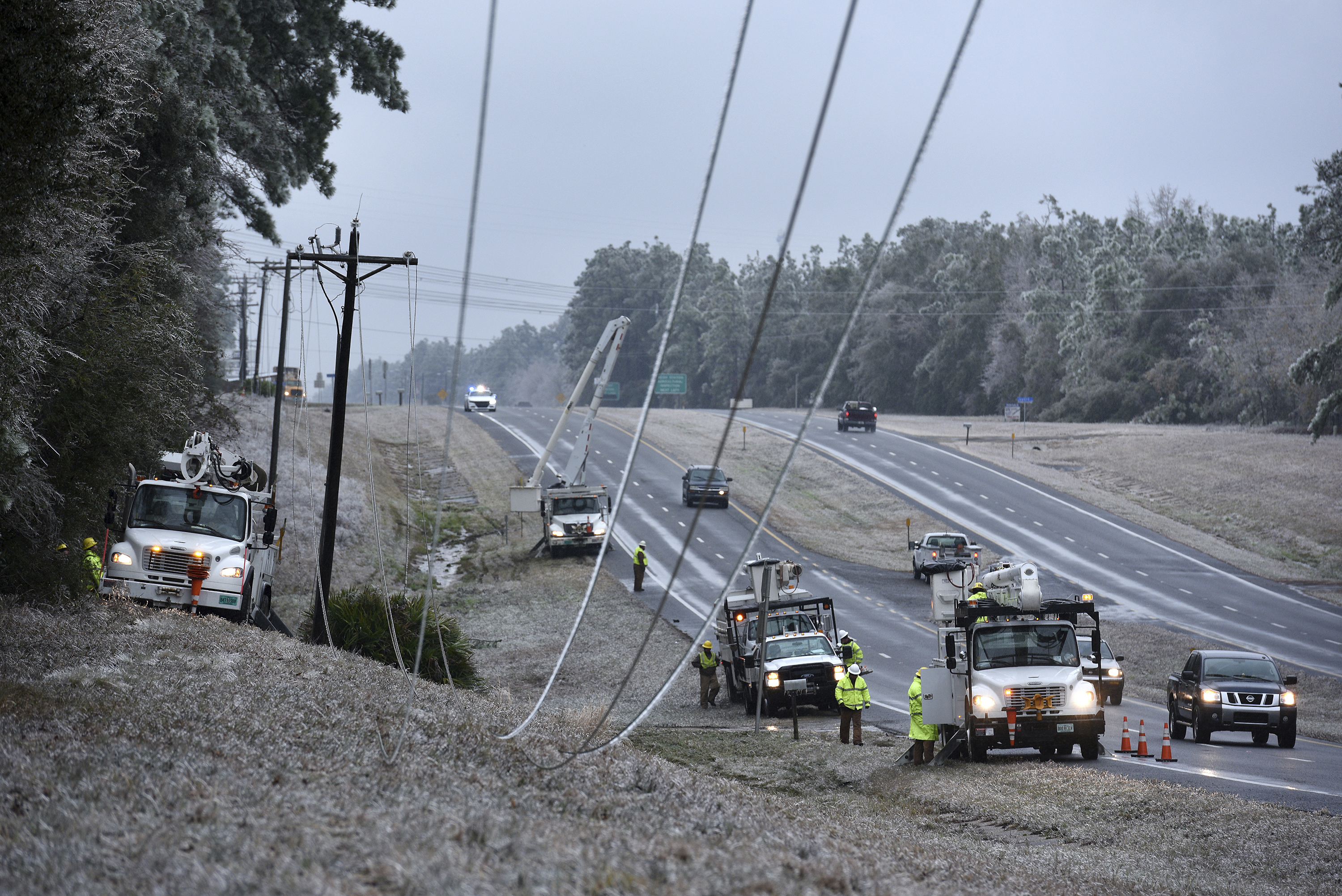 Crews work to repair downed utility lines along highway 301 near Hilliard, Fla., Wednesday, Jan. 3, 2018, just south of the Georgia state line, after an ice coated tree branch fell, taking the ice covered lines down with it. A brutal winter storm scattered a wintry mix of snow, sleet and freezing rain from normally balmy Florida up the Southeast seaboard Wednesday. (Bob Self/The Florida Times-Union via AP)