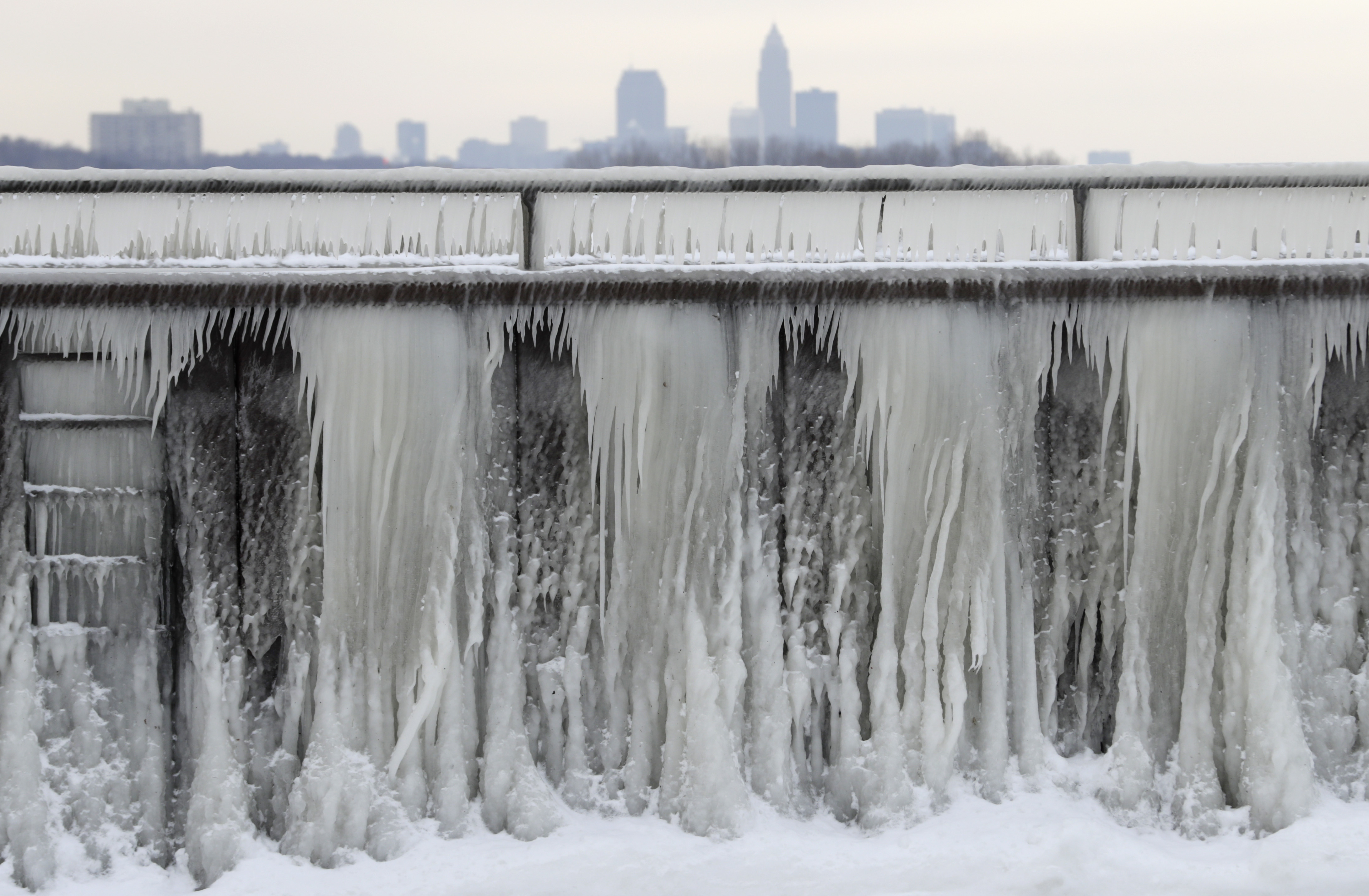 Ice forms on a breakwall along Lake Erie with the city of Cleveland in the background, Wednesday, Jan. 3, 2018, in Cleveland. Dangerously cold temperatures have gripped wide swaths of the U.S. from Texas to New England. (AP Photo/Tony Dejak)