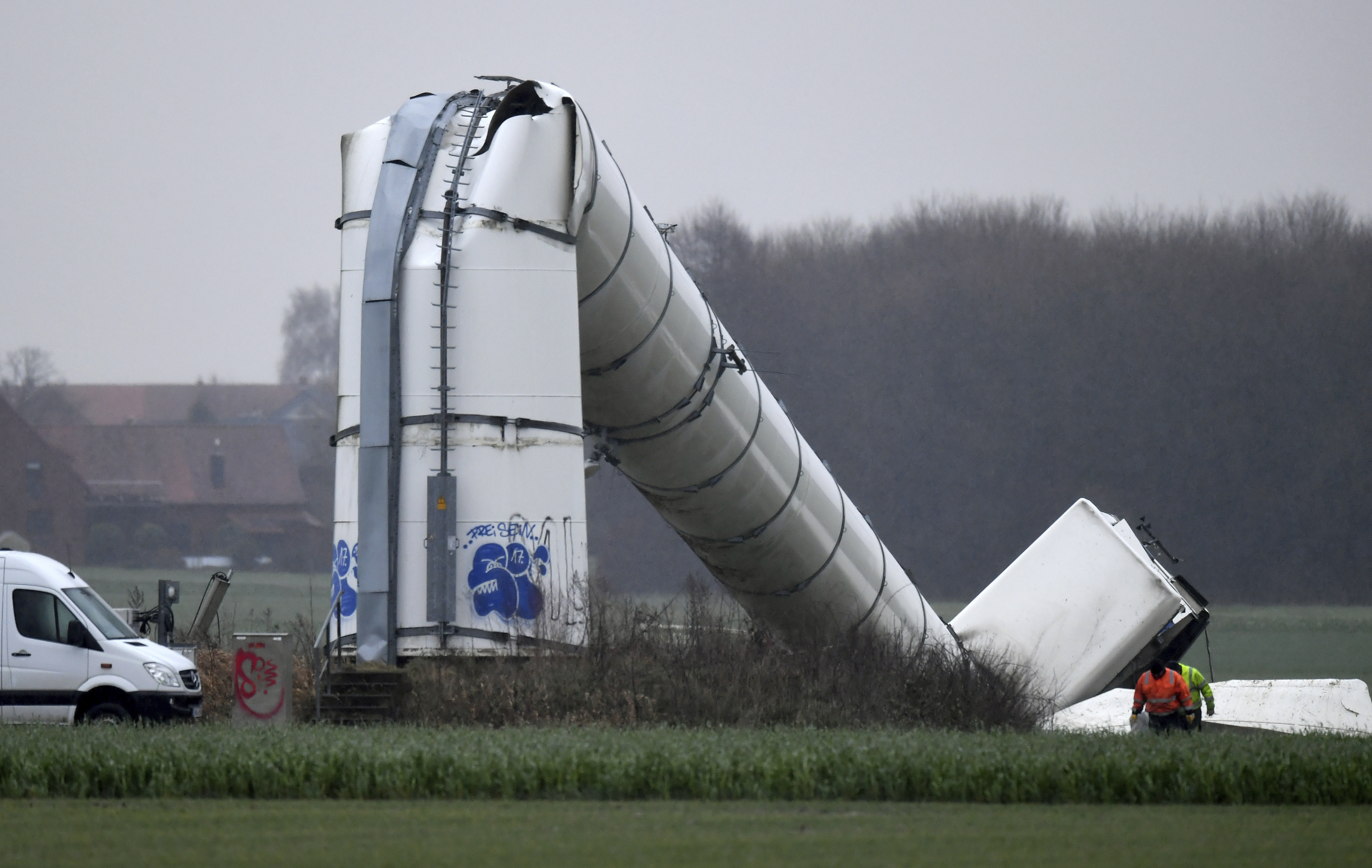 A wind power facility lies on a field after it collapsed during storm ‘Burglind’ in Volksdorf near Hannover, Germany, Wednesday, Jan. 3 2018. After parts of the rotor had broken, the tower of the roughly 70 meter tall wind wheel collapsed. Nobody was injured in the accident. (Holger Hollemann/dpa via AP)