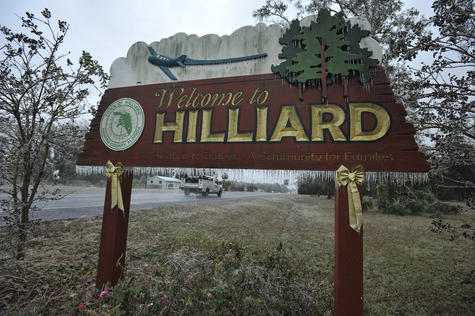 Icicles hang from the « Welcome to Hilliard sign » in Hilliard, Fla., Wednesday, Jan. 3, 2018. A brutal winter storm scattered a wintry mix of snow, sleet and freezing rain from normally balmy Florida up the Southeast seaboard Wednesday. (Bob Self/The Florida Times-Union via AP)