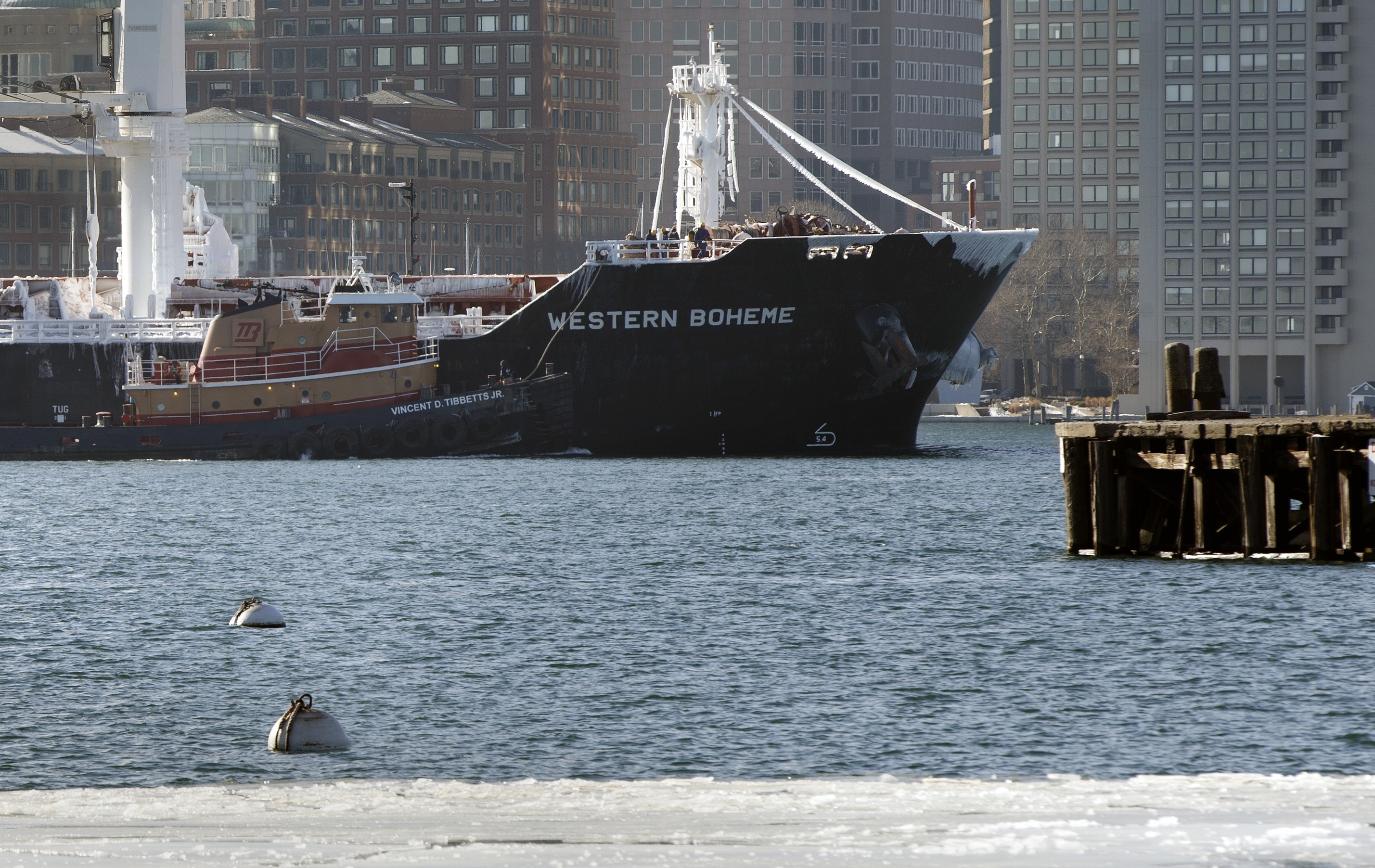 A ship with ice in the rigging moves through Boston Harbor, Wednesday, Jan. 3, 2018, in Boston. After a week of frigid temperatures, a major winter storm is predicted for the region on Thursday. (AP Photo/Michael Dwyer)