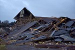 An agricultural building is collapsed during a heavy storm in Meimbressen, central Germany, Thursday, Jan. 18, 2018. A powerful storm lashed Europe with high winds and snow, killing at least four people in three countries, grounding flights, halting trains, ripping roofs off buildings and flipping over trucks. (Uwe Zucchi/dpa via AP)
