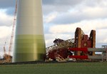 A toppled crane sits on a field beside a wind turbine after it was hit by storm ‘Friederike’ in Kirtorf, central Germany, Thursday, Jan. 18, 2018. (Philipp Weitzel/dpa via AP)