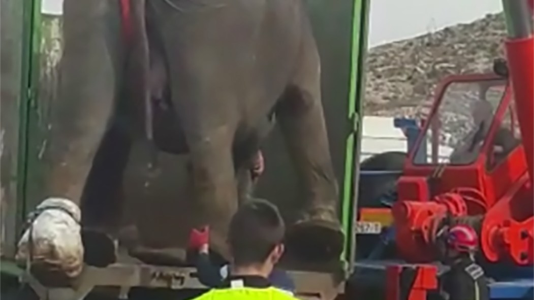 Sur une vidéo fournie par DGT, on voit un éléphant soulevé par une grue, tandis que des pompiers attrapent une de ses énormes pattes pour le stabiliser.