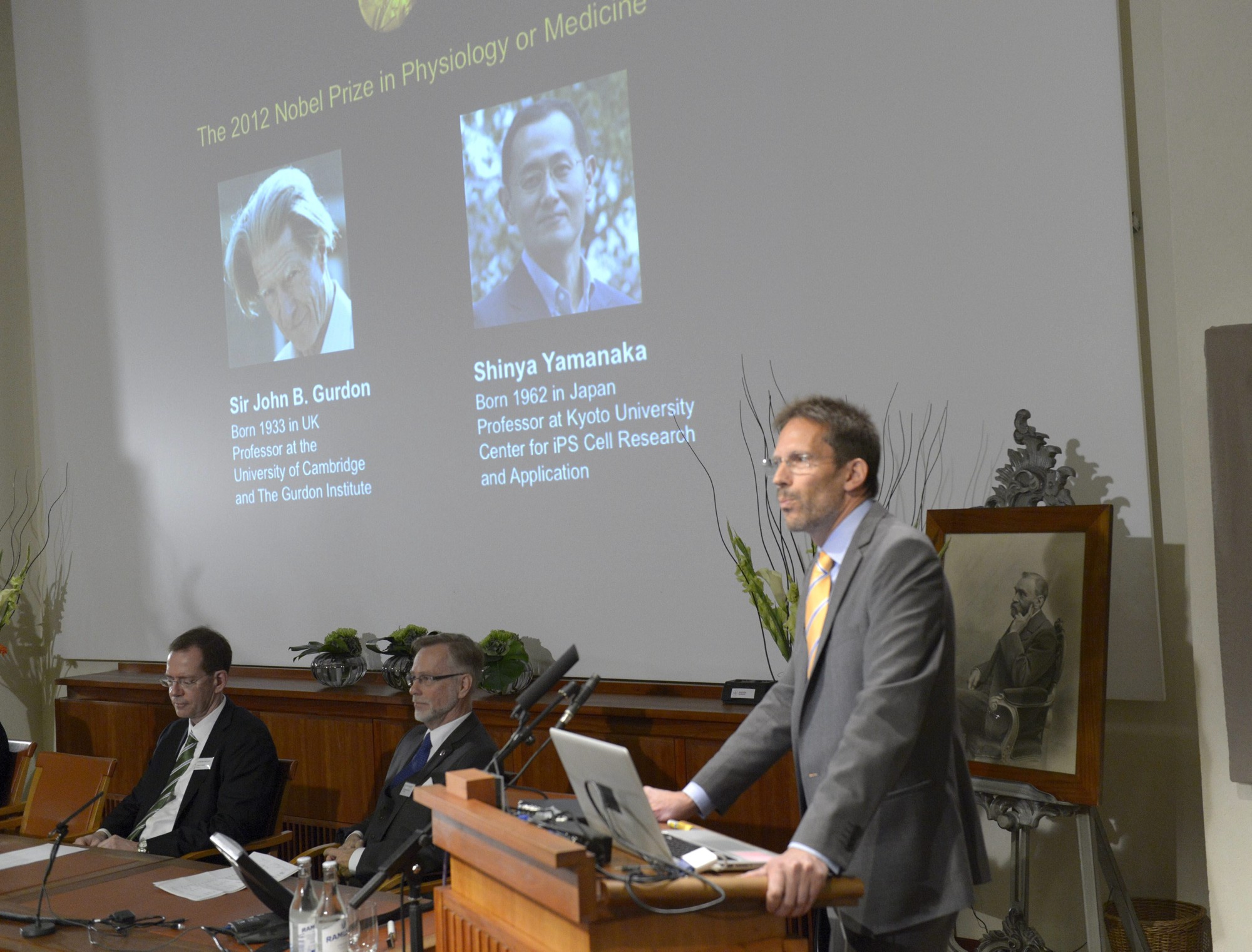 Sir John Gurdon, 79 ans, et Shinya Yamanaka, 50 ans, ont “révolutionné notre compréhension du développement des cellules et de l’organisme” en montrant qu’une cellule adulte pouvait retrouver les propriétés d’une cellule embryonnaire, a souligné l’assemblée des Nobel de l’Institut Karolinska.