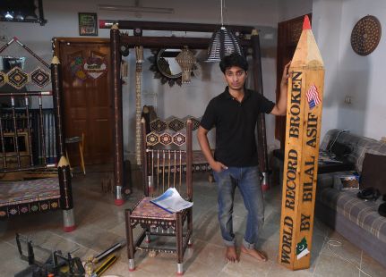 L’œil aussi affûté que la mine de ses milliers d’accessoires, Bilal Asif travaille avec soin à sa création, qu’il espère faire homologuer comme record du monde: la construction d’une balancelle entièrement composée de crayons de couleur.