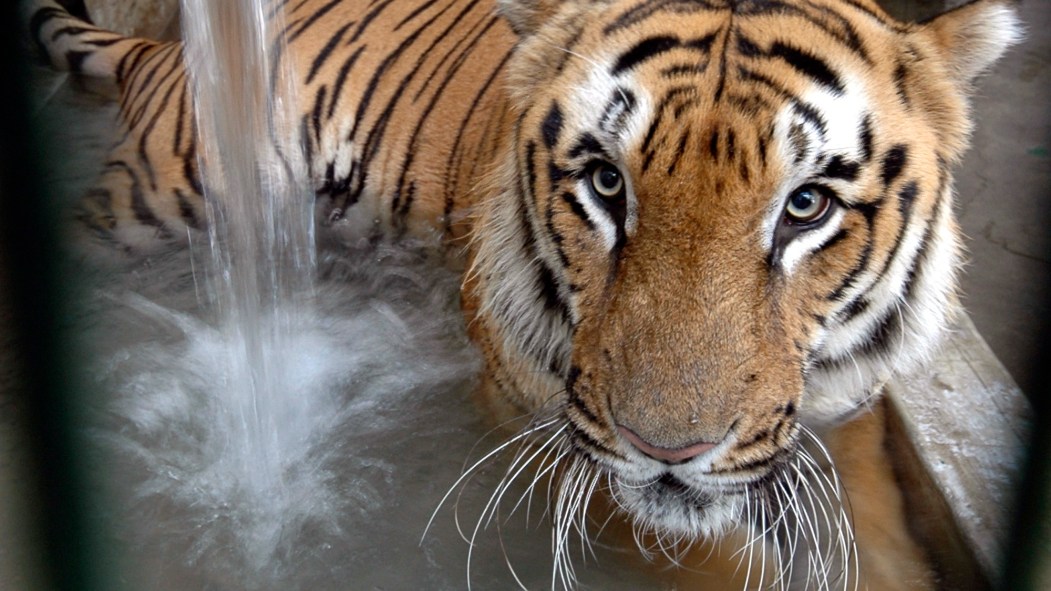 FILE- In this May 5, 2009 file photo, a tiger cools off at its enclosure at the zoo in Ahmadabad, India. Villagers in northern India have crushed a tiger to death with a tractor after it killed a man, despite the tiger living in a wildlife reserve, officials said Monday. (AP Photo/Ajit Solanki, File) Photo: The Associated Press