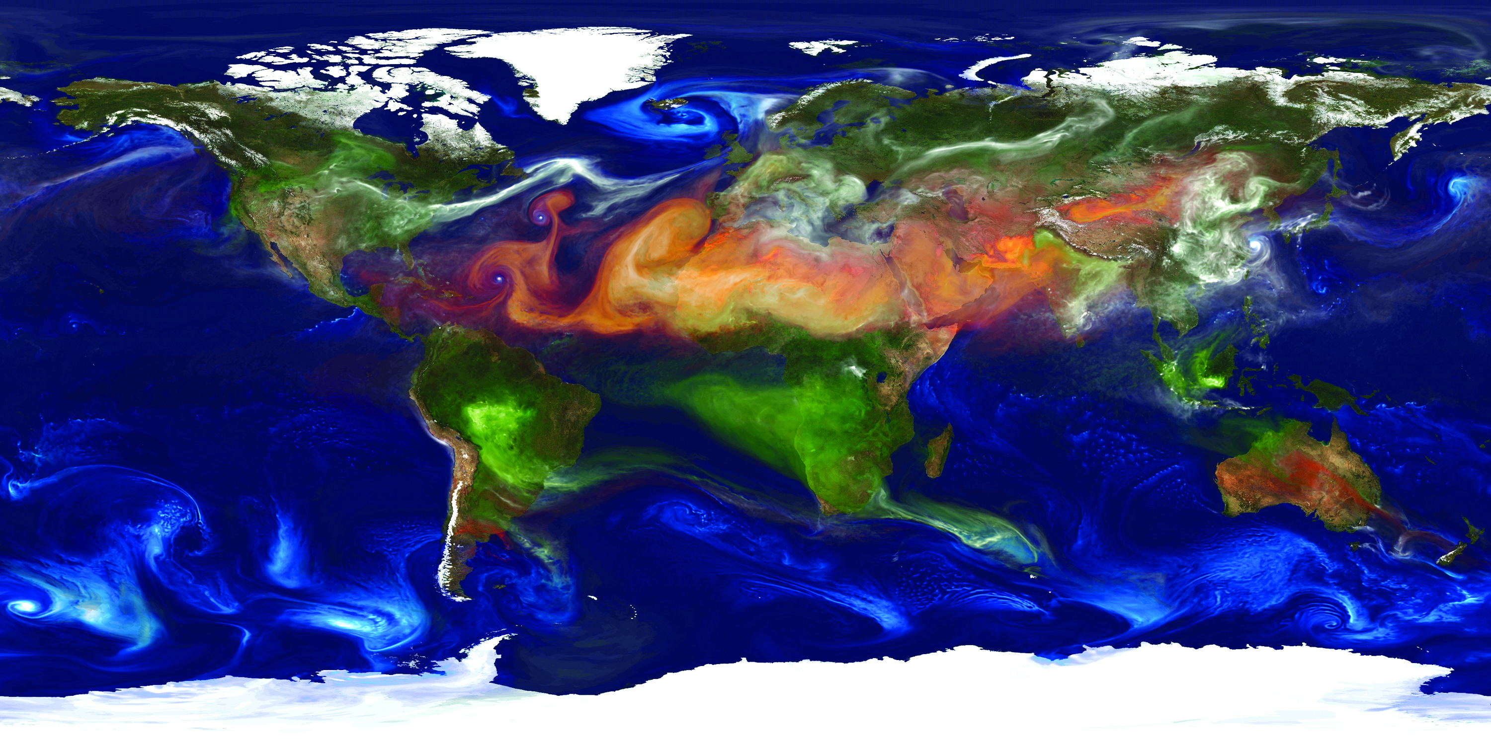 Cette surprenante image a été prise par le superordinateur «Discover» de la Nasa. Elle met en évidence les aérosols présents dans l’atmosphère. Le système d’observation de la Terre Goddard, version 5 (GEOS-5) peut voir la température mondiale à une résolution de 3,5 km (10 km en photo) dans le cadre de recherches scientifiques sur le climat.