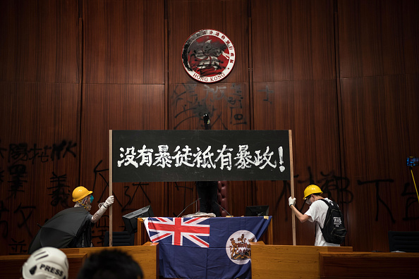 Les manifestants ont déployé un drapeau aux couleurs britanniques à la tribune du Conseil législatif (LegCo), le parlement local, où ils étaient entrés par dizaines, casqués et masqués, après avoir brisé à l’aide de barres de fer et d’autres instruments de fortune des baies vitrées blindées.