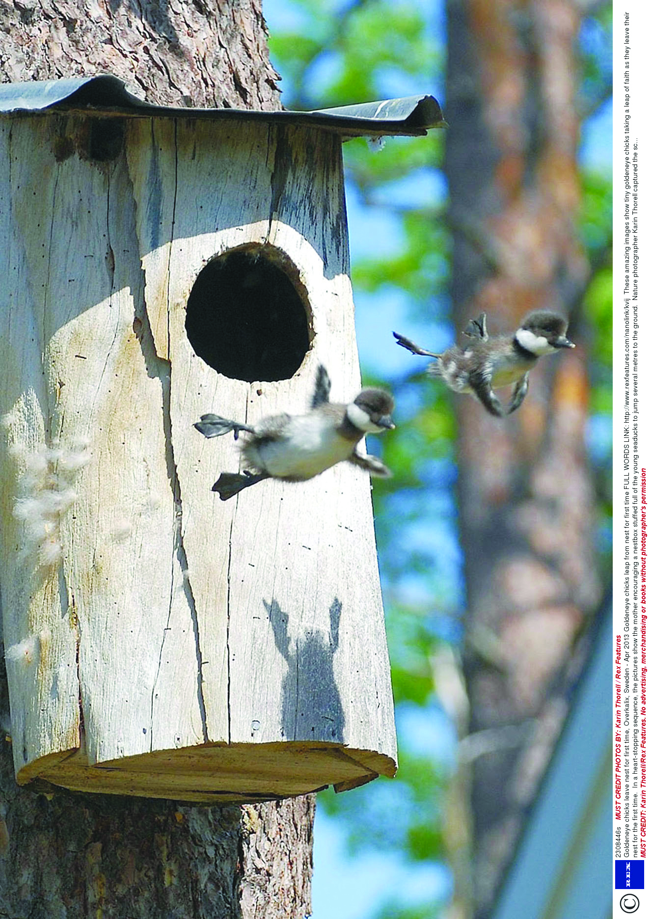 Cette image montre deux Buchephala clangula – ou garrots à œil d’or – en train de faire un saut dans le vide alors qu’ils quittent leur nid pour la première fois. Dans une scène à couper le souffle, la mère presse ses deux petits de prendre leur vol, alors que le sol se trouve des mètres plus bas. La photographe Karin Thorell a saisi le moment près de sa maison d’Överkalix, dans le nord de la Suède.