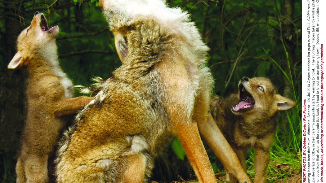 Ces deux jeunes coyotes, qui veulent désespérement suivre les traces de pattes de leurs parents commencent par apprendre à hurler. La photo prise par la photographe amateure Debbie DiCarlo montre ces adorables poupons en train d’imiter le coyote adulte, qui renverse la tête pour laisser s’échapper un hurlement perçant. Entrevue avec Debbie DiCarlo, 58 ans de Cleveland, en Ohio.