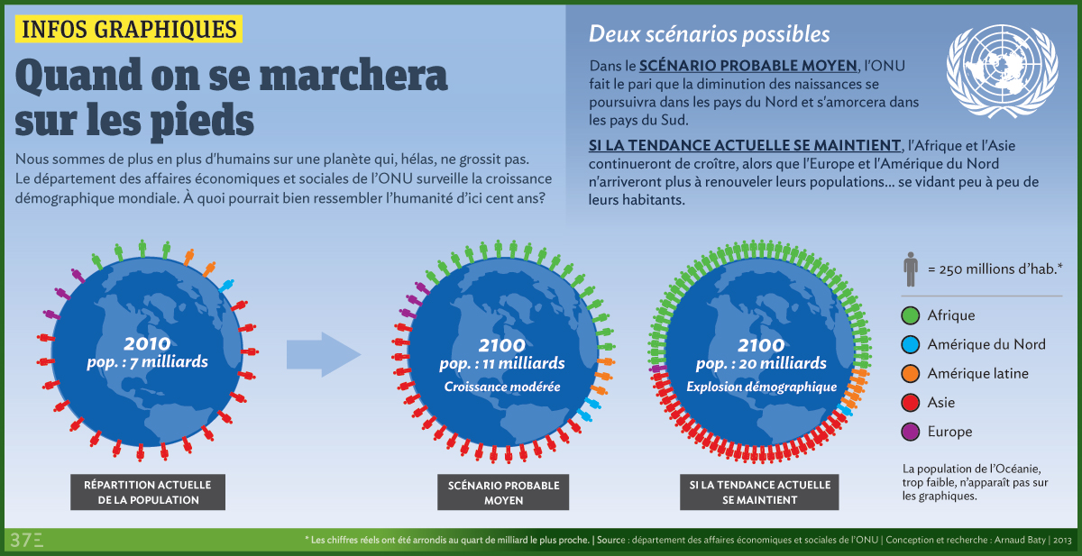 Nous sommes de plus en plus d’humains sur une planète qui, hélas, ne grossit pas. Le département des affaires économiques et sociales de l’ONU surveille la croissance démographique mondiale. À quoi pourrait bien ressembler l’humanité d’ici cent ans?
