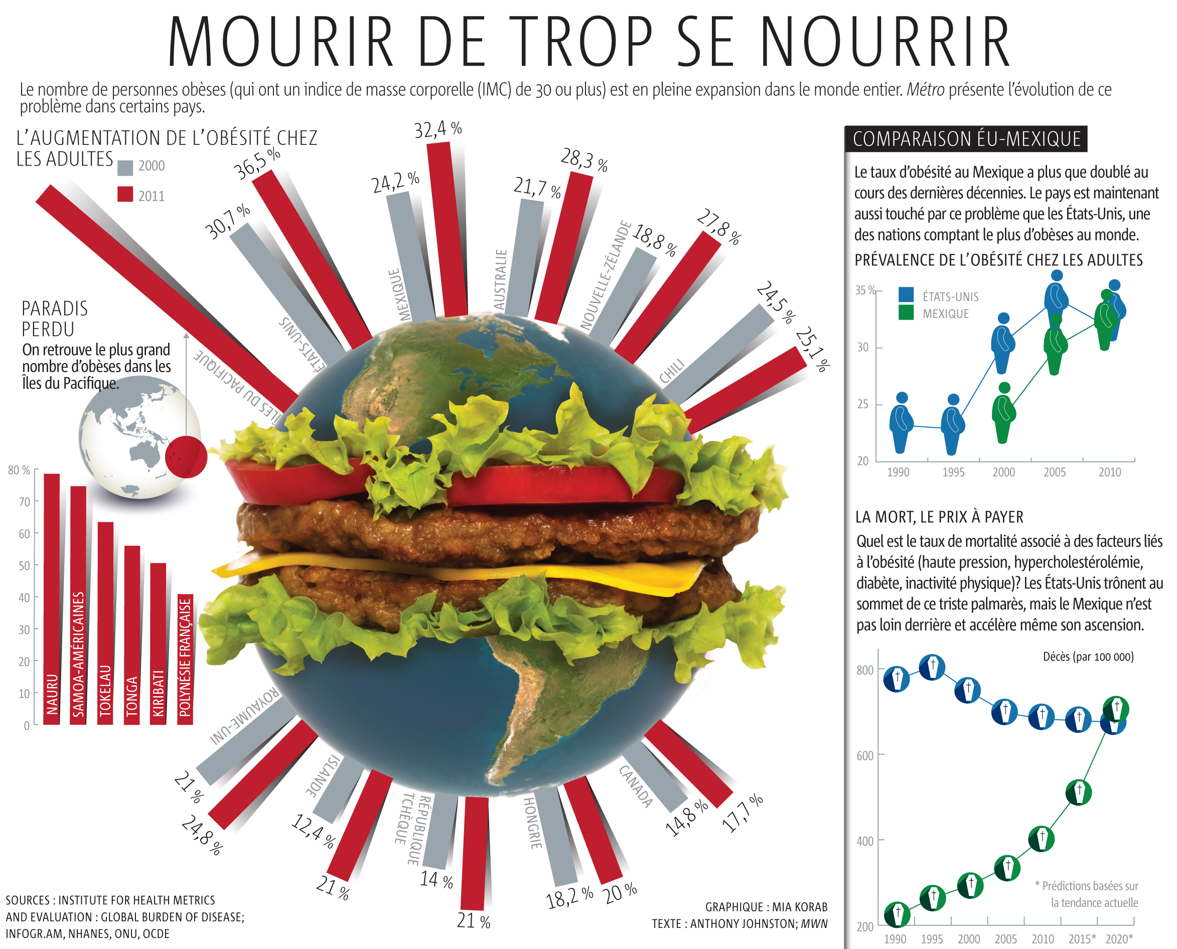 Le nombre de personnes obèses (qui ont un indice de masse corporelle (IMC) de 30 ou plus) est en pleine expansion dans le monde entier. Métro présente l’évolution de ce problème dans certains pays. (Cliquez sur l’image pour agrandir)