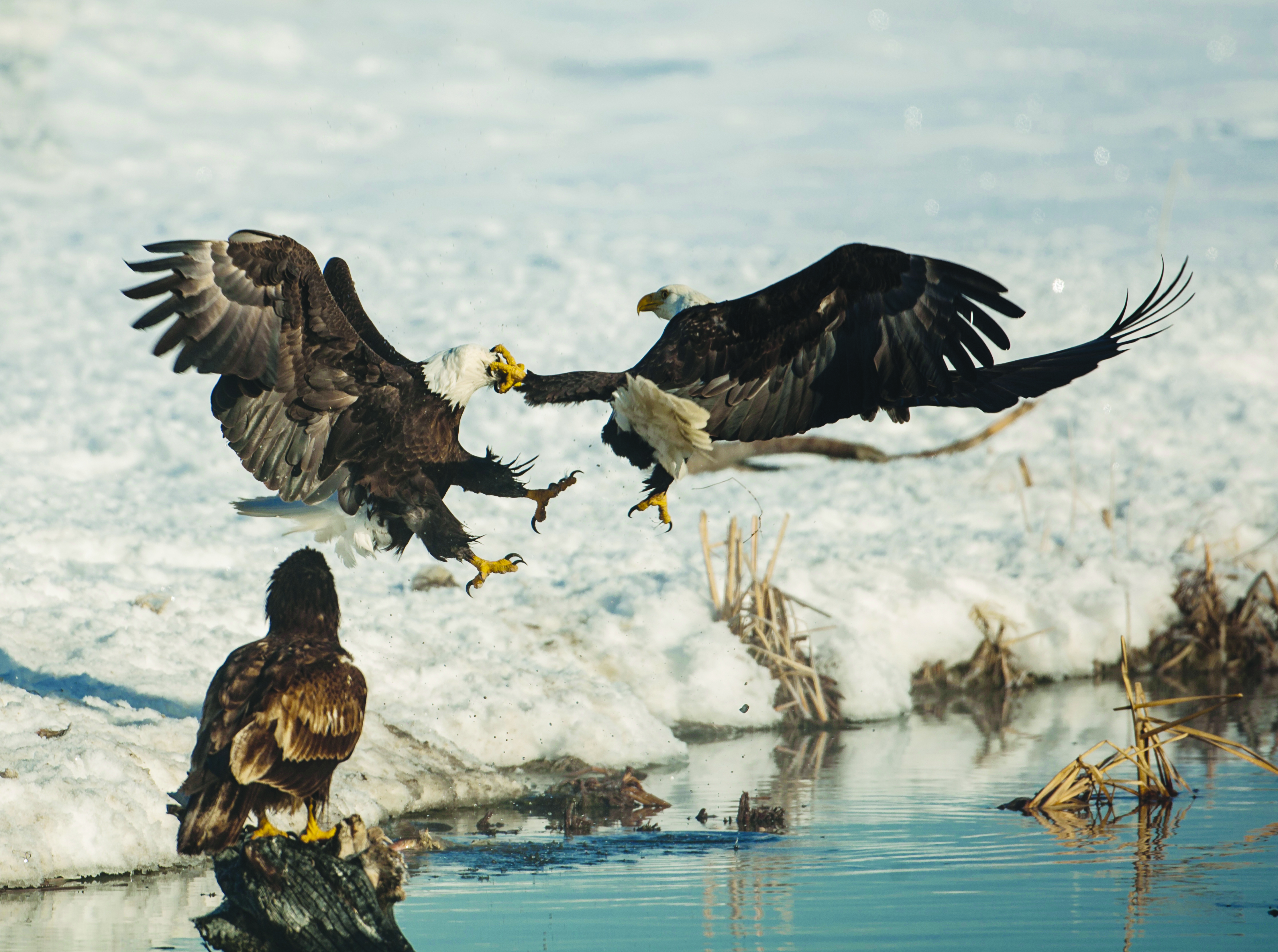 Ce pygargue à tête blanche prend la mesure d’un rival à l’aide d’un bon coup de serres bien placé. Ces redoutables oiseaux de proie en sont venus aux coups en raison du poisson descendant le cours d’eau. Le photographe Stan Rife, 55 ans, a regardé les plumes voler durant l’échauffourée près du lac Great Salt, situé dans le nord de l’État américain de l’Utah.