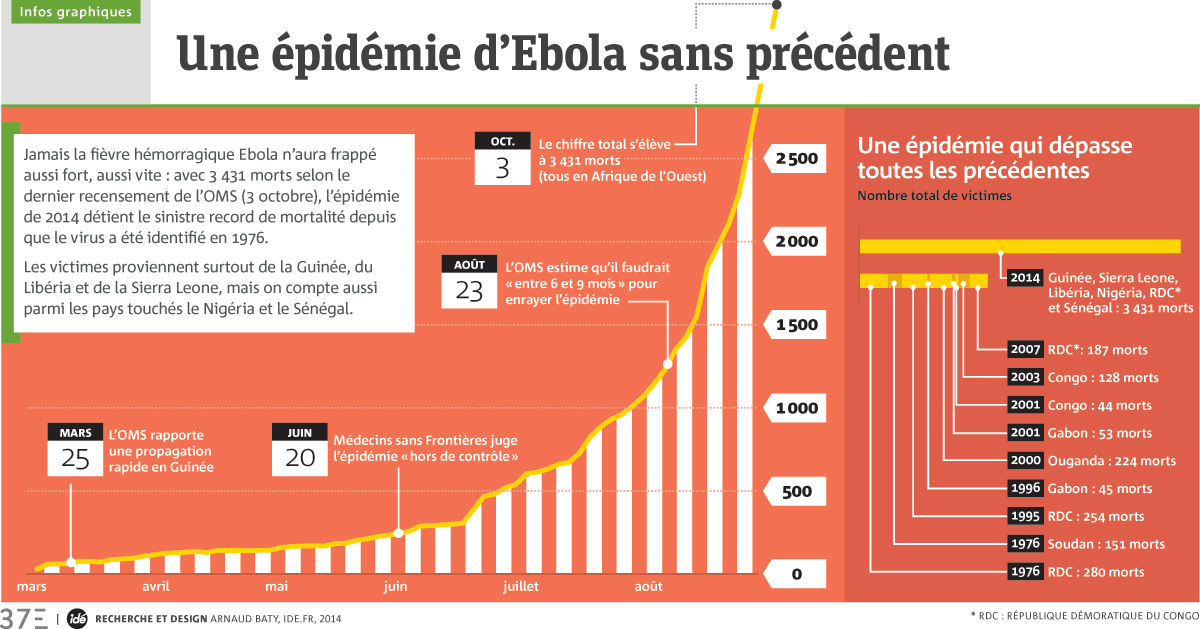 Jamais la fièvre hémorragique Ebola n’aura frappé aussi fort, aussi vite: avec 3431 morts selon le dernier recensement de l’OMS (3 octobre), l’épidémie de 2014 détient le sinistre record de mortalité depuis que le virus a été identifié en 1976. Les victimes proviennent surtout de la Guinée, du Libéria et de la Sierra Leone, mais on compte aussi parmi les pays touchés le Nigéria et le Sénégal.
