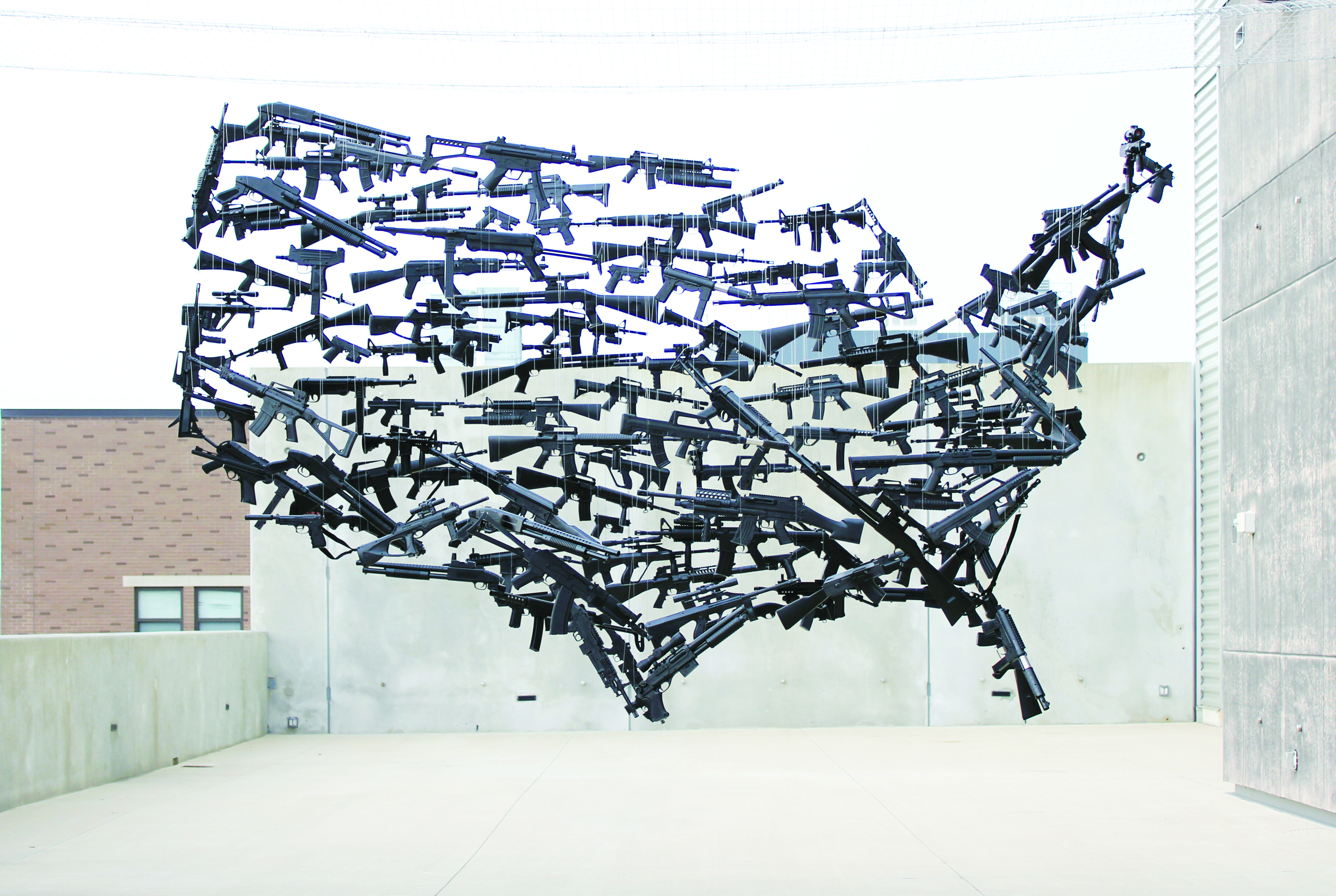 Le droit de posséder et de porter des armes à feu est un sujet controversé chez nos voisins du sud, mais l’artiste Michael Murphy n’a pas peur d’aborder le sujet. Il a suspendu des dizaines d’armes à feu jouets dans les airs pour recréer la forme de son pays. Gun Country est présentée au Urban Institute for Contemporary Arts, à Grand Rapids, dans l’État du Michigan.
