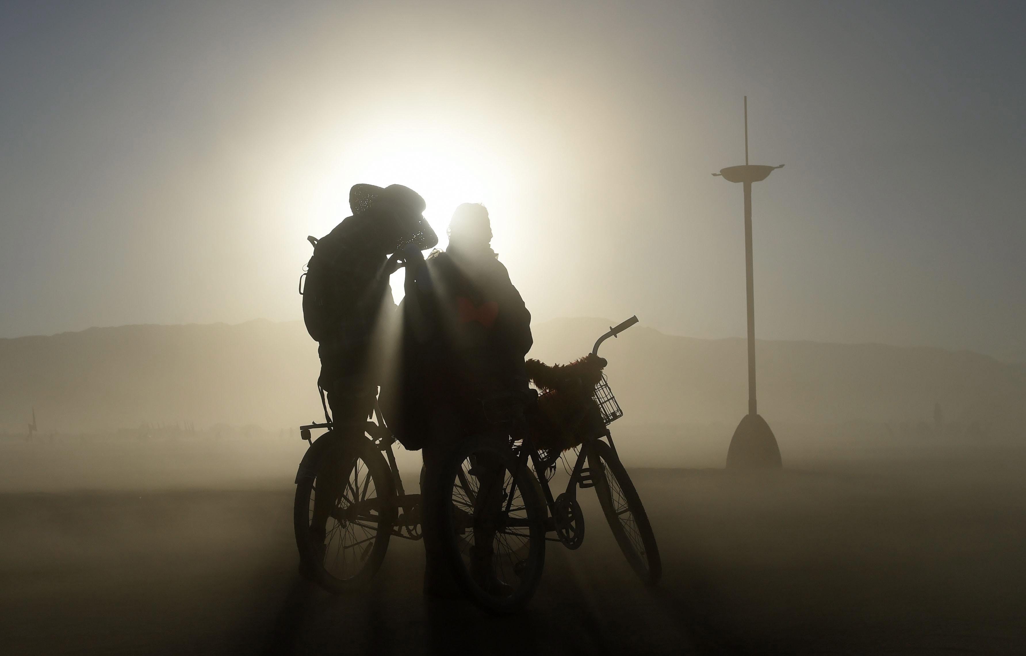 In this Friday, Sept. 4, 2015 photo, a couple cycling through the playa pauses during a dust storm at Burning Man in the Black Rock Desert near Gerlach, Nev. The annual festival is dedicated to community, art, self-expression and self-reliance. (Andy Barron/Reno Gazette-Journal via AP)