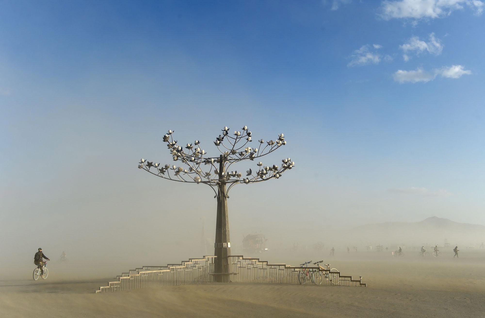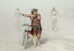 In this Friday, Sept. 4, 2015 photo, a « burner » rides next to a sculpture during a dust storm at Burning Man in the Black Rock Desert near Gerlach, Nev. The annual festival is dedicated to community, art, self-expression and self-reliance. (Andy Barron/Reno Gazette-Journal via AP)