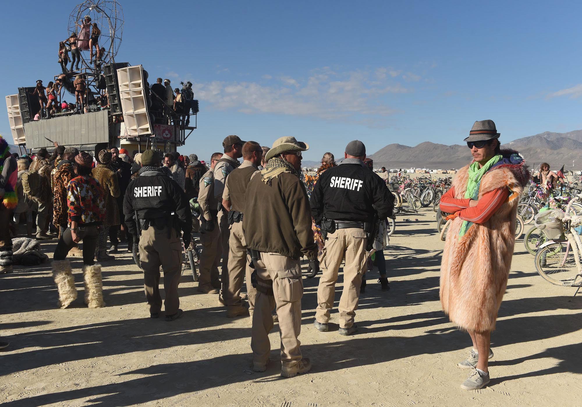Sheriffs keep an eye on « burners » at a party at Burning Man in the Black Rock Desert near Gerlach, Nev., on Saturday, Sept. 5, 2015. The annual festival is dedicated to community, art, self-expression and self-reliance. (Andy Barron/Reno Gazette-Journal via AP)