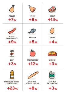 Selon Statistique Canada, les aliments qui ont enregistré une hausse importante au Québec sont les graisses et les huiles comestibles (+23%), le bœuf (+13%), les fruits frais (+12%), la viande transformée (+9%) et les produits de boulangerie (+9%). Le porc (+8%), le poulet (+7%), le poisson (+5%) et les œufs (+4%) coûtent aussi plus cher. En revanche, les prix des légumes frais sont demeurés stables.
