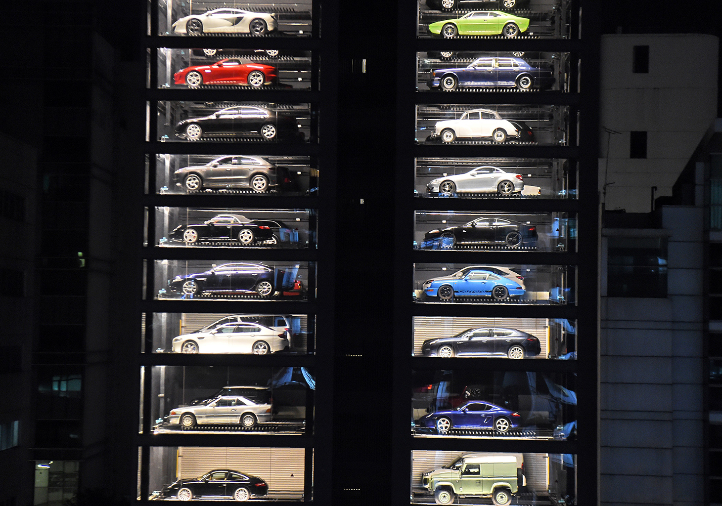 Les voitures sont empilées dans quatre colonnes vitrées de 15 étages, visibles de la rue.