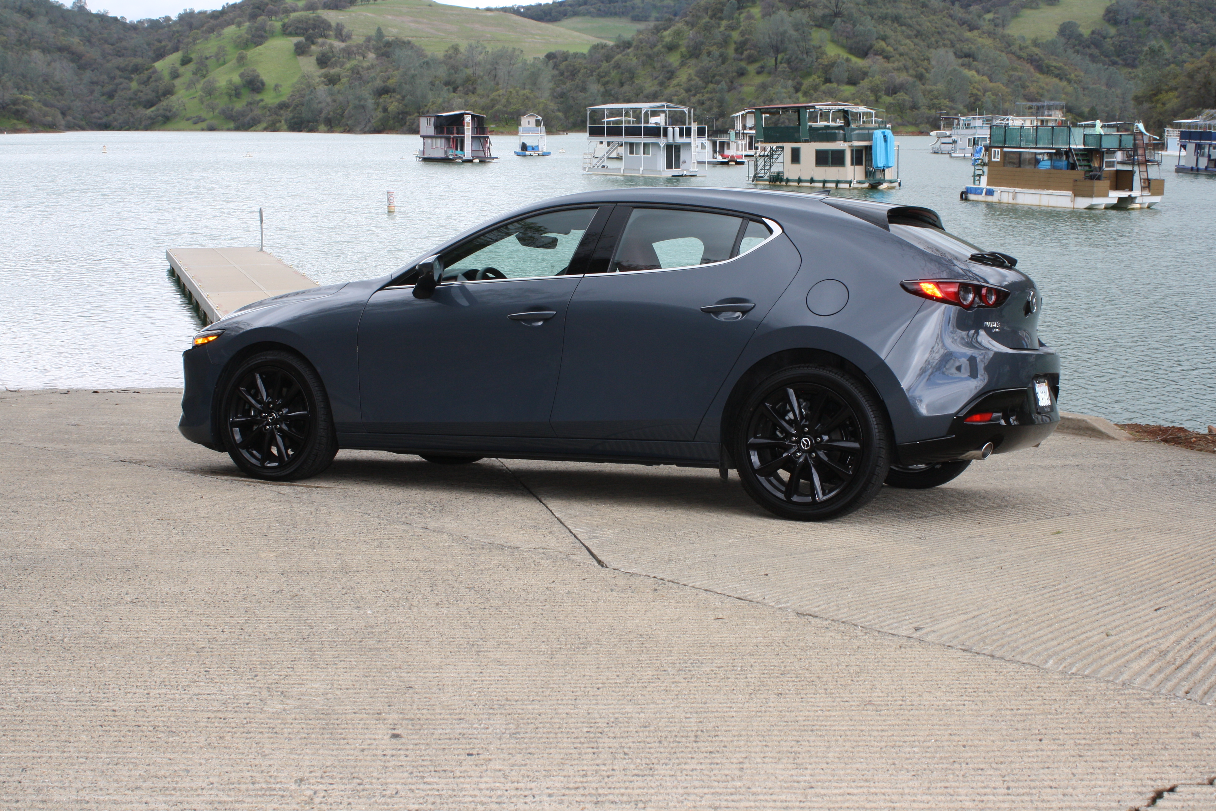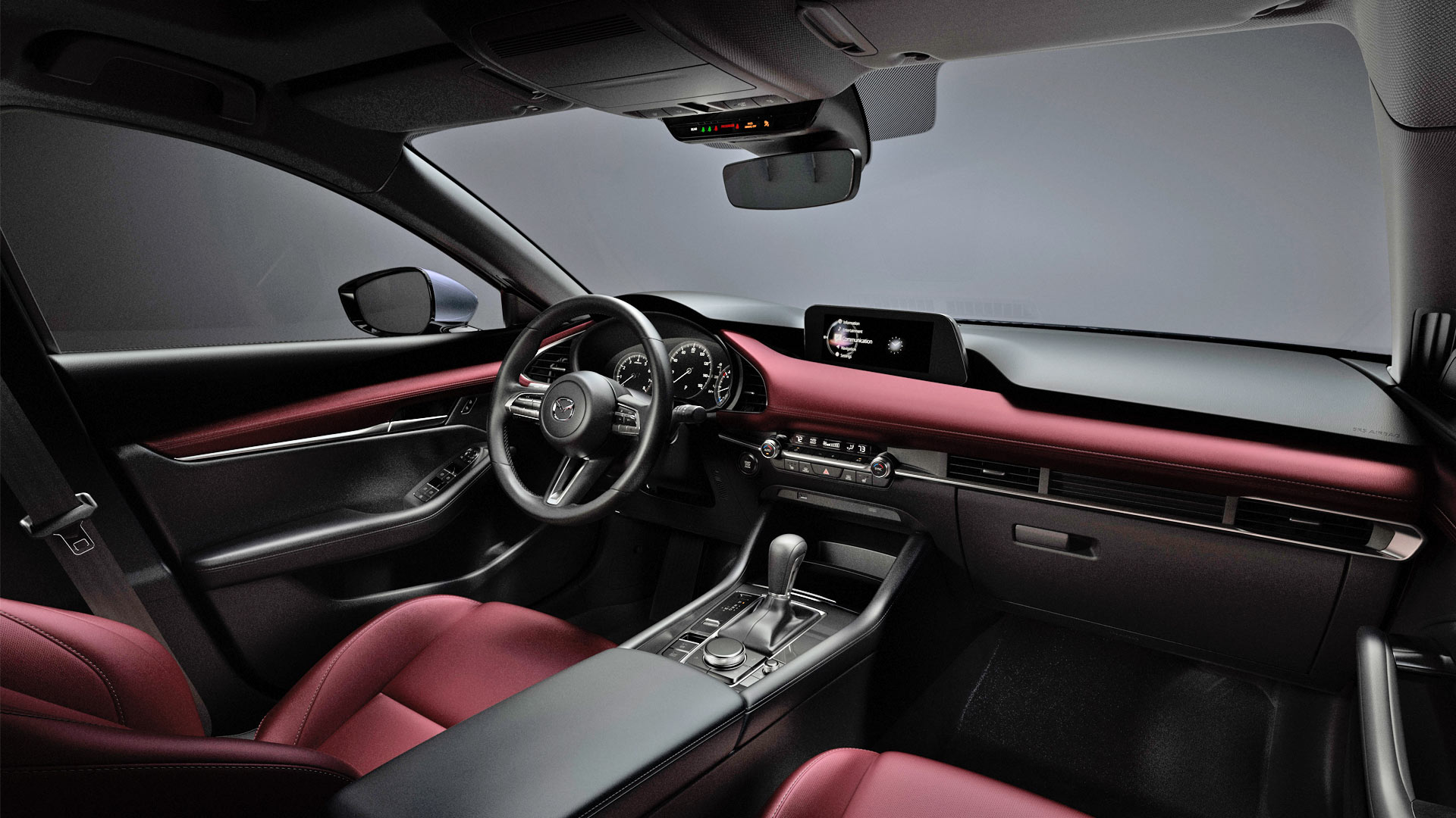 L’intérieur du véhicule a été complètement repensé pour élever le niveau de luxe. Tous les modèles de la première de série sont équipés d’applications Apple CarPlay et Android accessibles sur un nouvel écran de 8,8 pouces. L’écran n’est pas tactile et placé plus loin du conducteur, hors de portée de main, afin de minimiser les distractions affirme Mazda. Le menu à l’écran est relativement facile à utiliser et les jauges devant le conducteur sont digitales et configurables. La forme du toit limite l’espace disponible pour les passagers à l’arrière et l’espace cargo n’est pas très grand. Dans les deux cas, vous serez mieux servis avec la berline. Les modèles GT de la version sport peuvent être habillés de cuir rouge qui se marie très bien avec la nouvelle couleur gris métallique.
