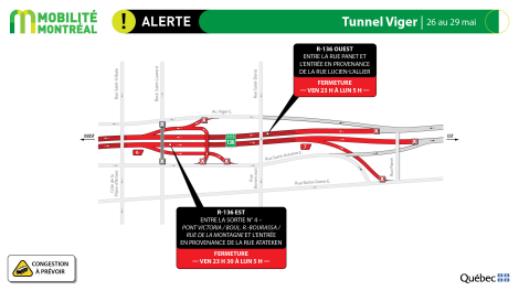 La route 136 en direction est sera également fermée aux mêmes heures, entre la sortie 4 Pont Victoria/Boul. R.-Bourassa/Rue de la Montagne et l’entrée de la rue Atataken. En direction ouest, la route 136 sera quant à elle fermée entre la rue Panet et l’entrée en provenance de la rue Lucien-L’Allier de vendredi 23h à lundi 5h. Cette fermeture est causée par les travaux dans les tunnels Ville-Marie et Viger.