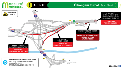 L’échangeur Turcot sera lui aussi entravé cette fin de semaine. La bretelle menant de l’autoroute 20 en direction est à la route 136 en direction est sera fermée de vendredi 23h30 à lundi 5h.