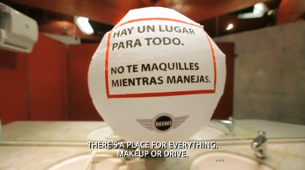 Selon le constructeur, au Mexique, 22% des accidents sont causés par des femmes. Du même souffle, il nous apprend que 60% des femmes n’iraient jamais travailler sans maquillage, et que 25% d’entre elles croient même que s’y rendre sans maquillage pourrait leur coûter une promotion.