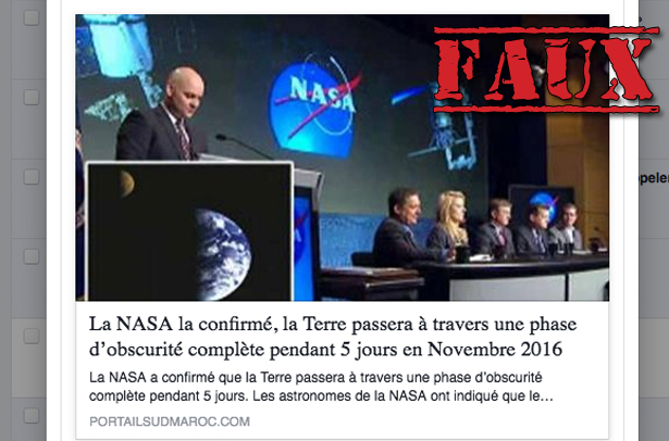 «La NASA la (sic) confirmé, la Terre passera à travers une phase d’obscurité complète pendant 5 jours en Novembre 2016», titre l’article, que très très peu de gens ont lu avant de partager (quelque 37 000 interactions sur Facebook).