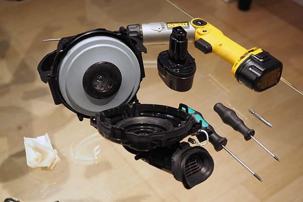 Note d’assemblage: quand le moteur arrive chez Dyson, il suffit de brancher quelques fils à l’intérieur, de poser une pièce de plastique qui sert à la fois d’interrupteur et de protecteur de fils, de poser du ruban adhésif et de visser le tout.
