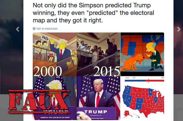 «Non seulement les Simpson ont prédit la victoire de Trump, ils ont même prédit la carte électoral et ont eu raison», peut-on lire dans ce gazouillis retweeté près de 89 000 fois.