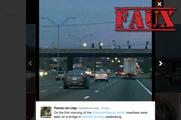 On the first morning of the #ElectionResults #KKK members were seen on a bridge in #NorthCarolina, celebrating pic.twitter.com/HdQPuhFc4z