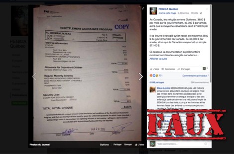 Pégida affirme que le réfugié syrien moyen obtient 3600$ par mois du gouvernement fédéral, ce qui donne 43 000$ par année (c’est plutôt 43 200$, mais bon). Mais – horreur! – le Canadien moyen gagne 27 600$ par année (ou est-ce 27 100$? La même publication offre deux chiffres différents)!