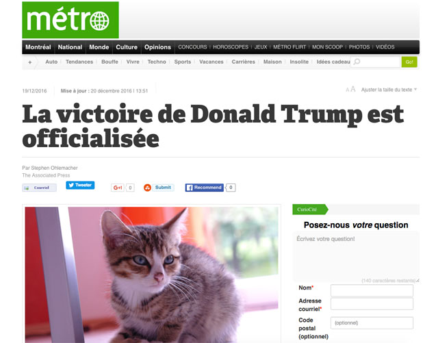 Si vous êtes tannés de voir (partout, partout, partout) la photo du président-élu américain, Donald Trump, et que vous aimez les chats, voici quelque chose juste pour vous.