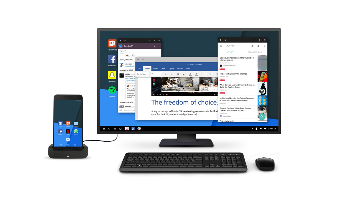 Il y a eu Palm avec le Foleo, puis Motorola avec le Atrix, puis Canonical avec Ubuntu Phone, puis Microsoft avec Windows Continum et il y a maintenant Jide avec Remix OS for Mobile, qui propose une énième mouture d’une réponse (intéressante) à un besoin technologique (inexistant) : la possibilité de transformer un téléphone intelligent en véritable ordinateur.