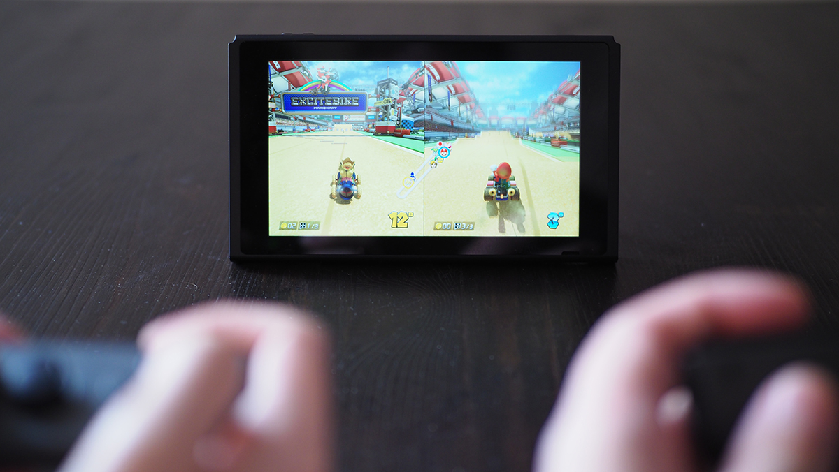 Lorsque la Switch est branchée sur un téléviseur, on peut ainsi jouer à quatre sur un écran partagé hors ligne, à deux sur un écran partagé en ligne et à deux sur un écran partagé en mode sans fil local avec d’autres Switch (jusqu’à huit joueurs en tout).