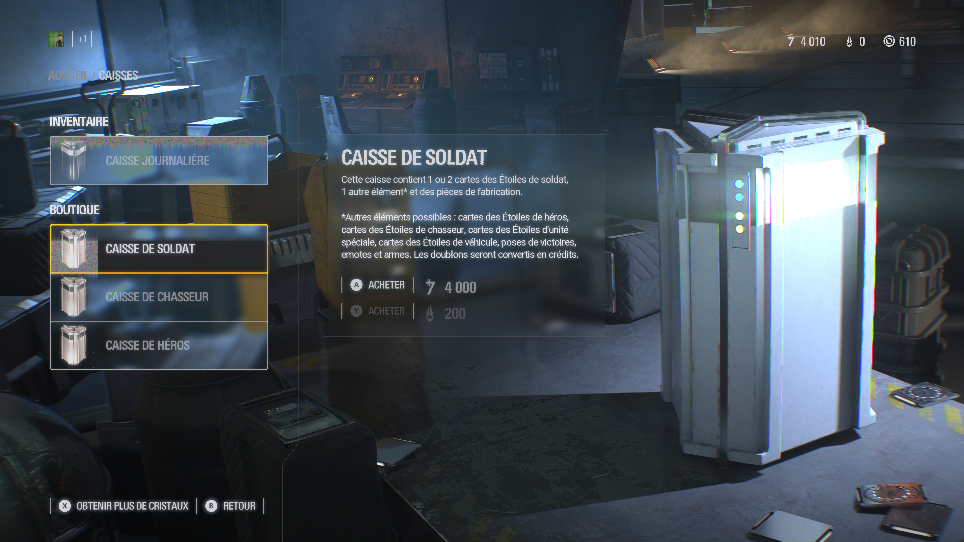 On améliore son personnage dans Battlefront 2 à l’aide de boîtes aléatoires, une stratégie de plus en plus populaire dans l’industrie. Celles-ci ne sont pas forcément mauvaises : Blizzard a par exemple bien intégré le concept dans son jeu Overwatch, où des items cosmétiques sont donnés aux joueurs qui soutiennent le développement du jeu en achetant de telles boîtes. Malheureusement, le contenu des boîtes de Battlefront 2 affecte non pas l’allure des armes, mais leur puissance. Jouer des dizaines d’heures n’est donc pas suffisant pour s’améliorer: il faut en plus être chanceux.