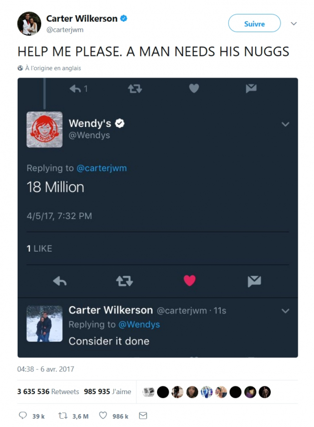 Un drôle de défi a battu tous les records de retweets sur le réseau social twitter en 2017. La célèbre chaîne de restauration rapide Wendy’s a promis des nuggets gratuits pendant un an à l’un de ses clients si celui-ci réussissait à retweeter sa demande plus de 18 millions de fois. De fait, l’appel de Carter Wilkerson, «Help Me Please! A man needs his nuggs» a été partagé plus de 3,6 millions de fois, finalement assez pour qu’il reçoive son précieux poulet frit.