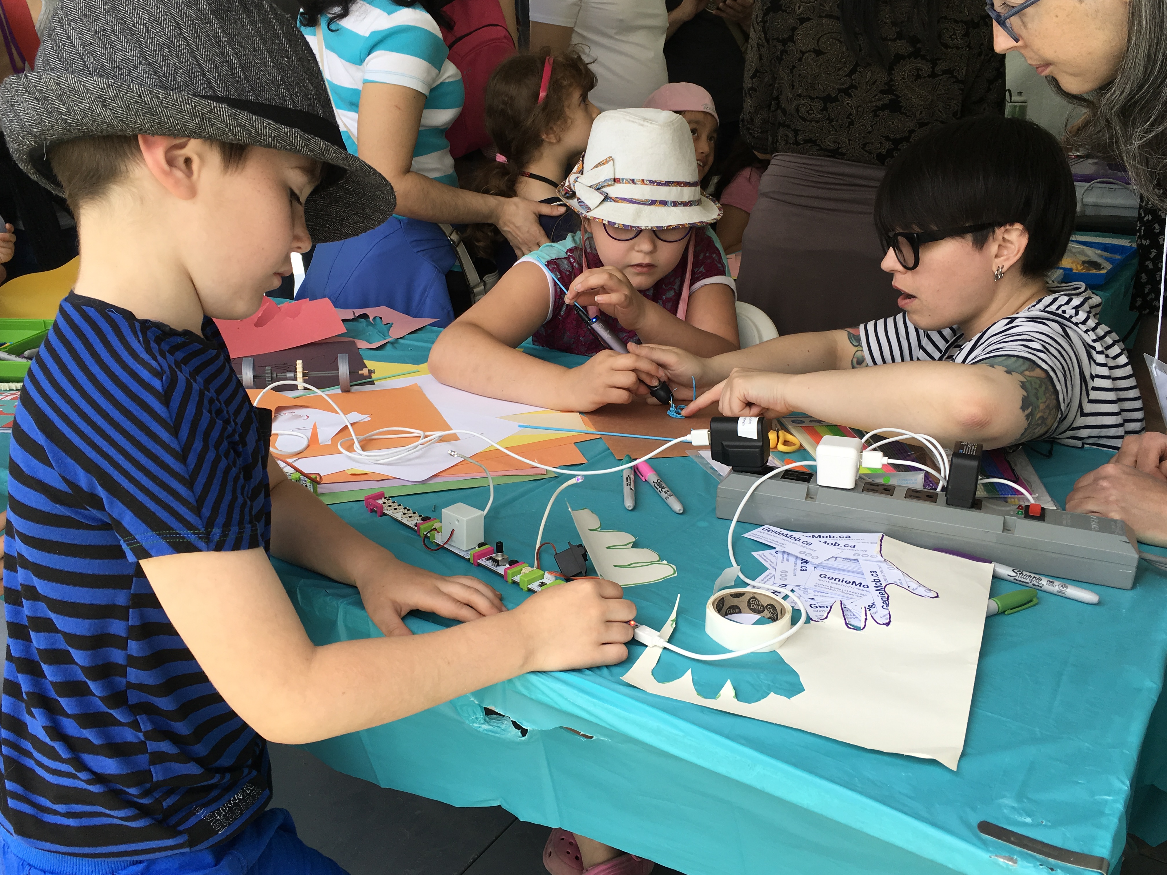 Les années passent et Évelyne commence à repenser à sa jeunesse sur les bancs d’école et à quel point l’éducation avait été un échec pour elle. Elle ne doit pas être la seule dans cette situation, elle peut repenser l’expérience de la classe et la faire à sa manière: faire des grappes de bureaux, des salles en U, pas d’écran, pas de présentation, juste des mains, de l’imagination et soi-même. «On peut donner un cours de géographie en élaborant une fresque interactive. Si le continent Afrique s’affiche en clignotant, l’enfant va s’en souvenir.», explique-t-elle. Pour la jeune femme, les méthodes d’enseignement qui combinent plusieurs matières sont la clé pour intéresser les enfants aux troubles de comportement. C’est comme ça que l’entreprise GenieMob est née. Ça fait un an et demi. Elle se déplace dans les écoles, les centres culturels, les centre communautaires et les centres jeunesse.