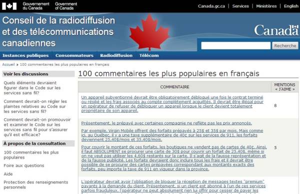 Le travail du CRTC par rapport à l’élaboration de ce code est loin d’être terminé, mais l’organisme a néanmoins publié les 100 commentaires les plus populaires en anglais et en français des Internautes qui ont participé à son sondage en ligne.