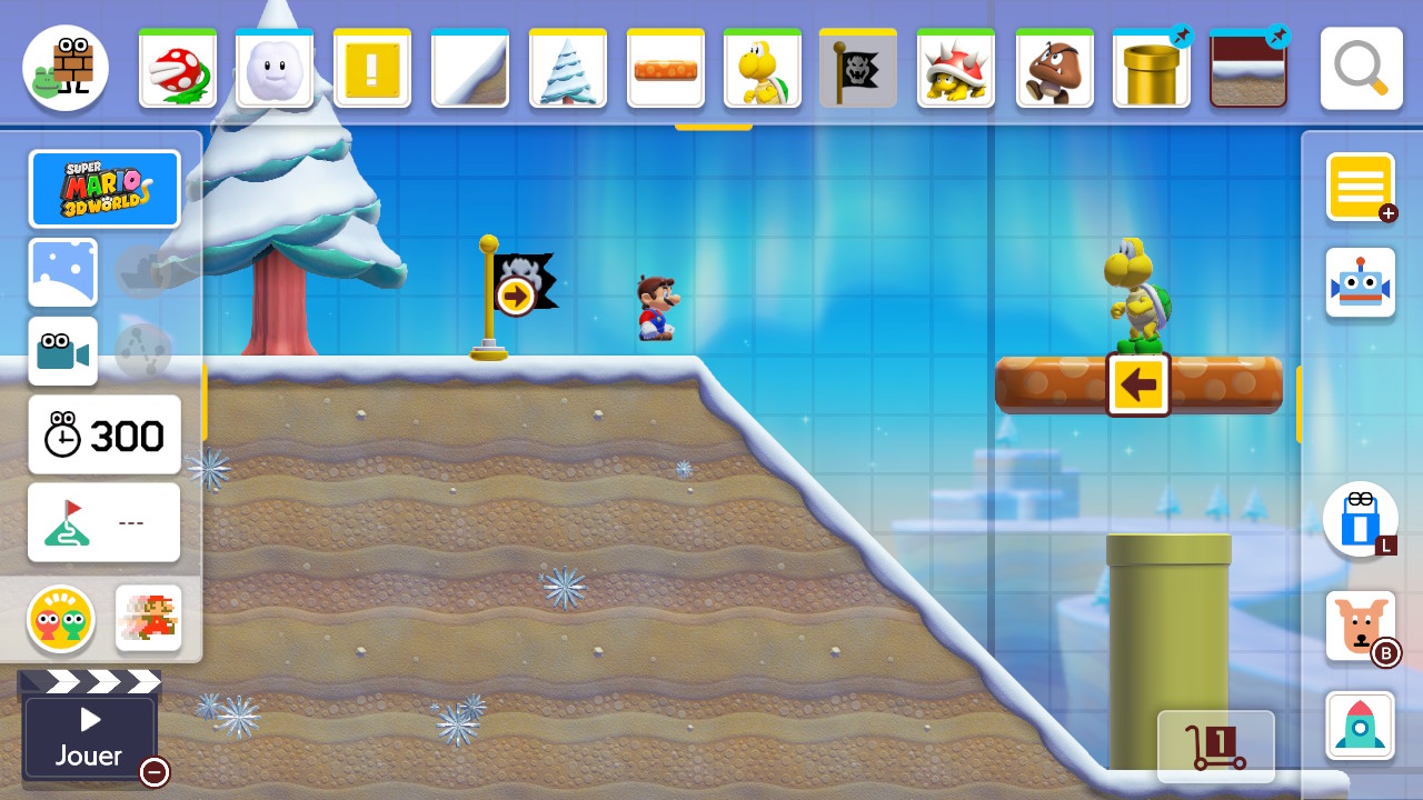 Vous souhaitez faire sauter Mario par-dessus des trous de lave dans une caverne? Le faire monter une montagne enneigée pleine de tortues? Lui permettre de voler entre les nuages? Aucun problème. Il suffit de glisser un objet ici et un morceau de terrain-là pour concrétiser ses idées les plus folles. Aucune programmation n’est nécessaire. On utilise idéalement l’écran tactile de la Switch pour dessiner notre niveau, mais il est aussi possible d’utiliser une manette, si on veut le faire sur la télé du salon ou à jeux joueurs en même temps. Une fois que tous les éléments sont en place, il ne reste qu’à appuyer sur Jouer et à traverser son tableau avec Mario.