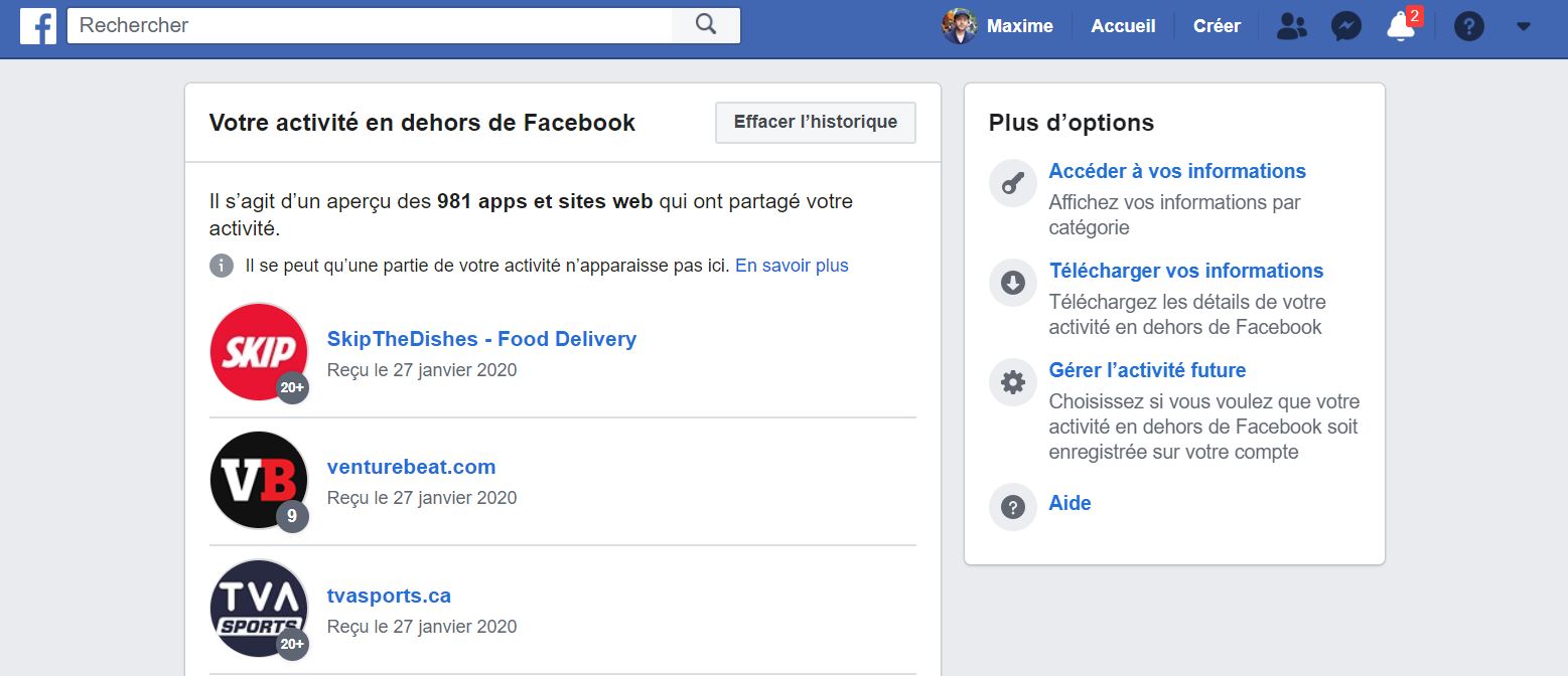 La majorité des sites que je consulte y sont répertoriés. Facebook ne permet pas de voir ce que l’entreprise sait sur nous avec précision grâce à cet outil, mais seulement que du contenu a été consulté, qu’une appli a été ouverte ou que quelque chose a été acheté, par exemple. Facebook n’affiche pas non plus les informations obtenues alors que l’utilisateur n’était pas enregistré sur le site.