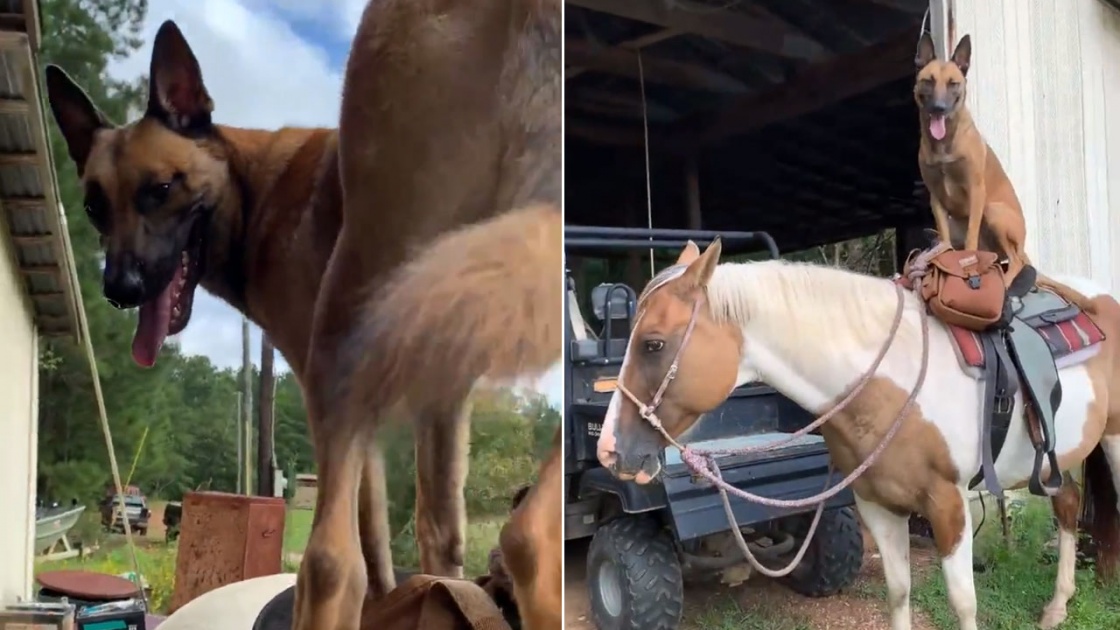 En attendant que sa maîtresse se prépare à monter son cheval, c’est son chien qui y prend place.
