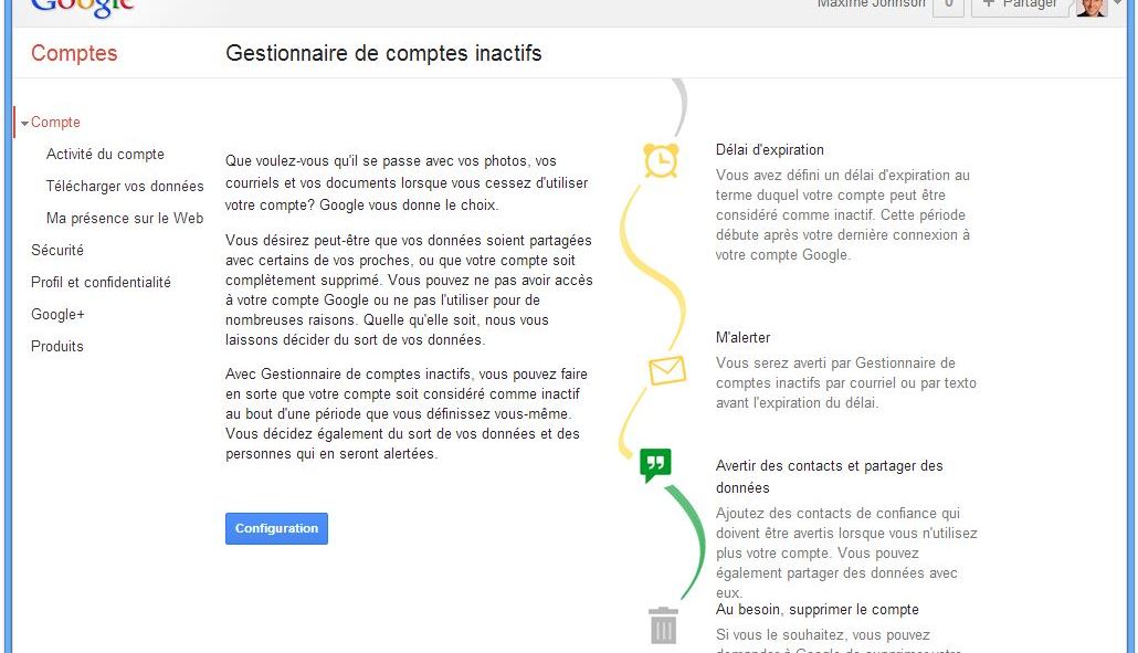 Google a notamment lancé la semaine dernière son nouveau Gestionnaire de comptes inactifs – un nom qui laisse franchement à désirer, selon l’aveu même de la compagnie –, un outil qui permet de choisir ce qui surviendra avec notre compte Google (courriels, photos, etc.) après une certaine période d’inactivité (3 mois, 6 mois, 9 mois ou un an).
