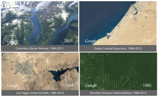 Google et TIME ont rassemblés certains des endroits les plus impressionnants, comme la croissance de la ville de Las Vegas et l’irrigation en Arabie Saoudite, mais aussi la déforestation de la forêt amazonienne, la fonte de glaciers en Alaska et l’assèchement du lac Urmia en Iran.