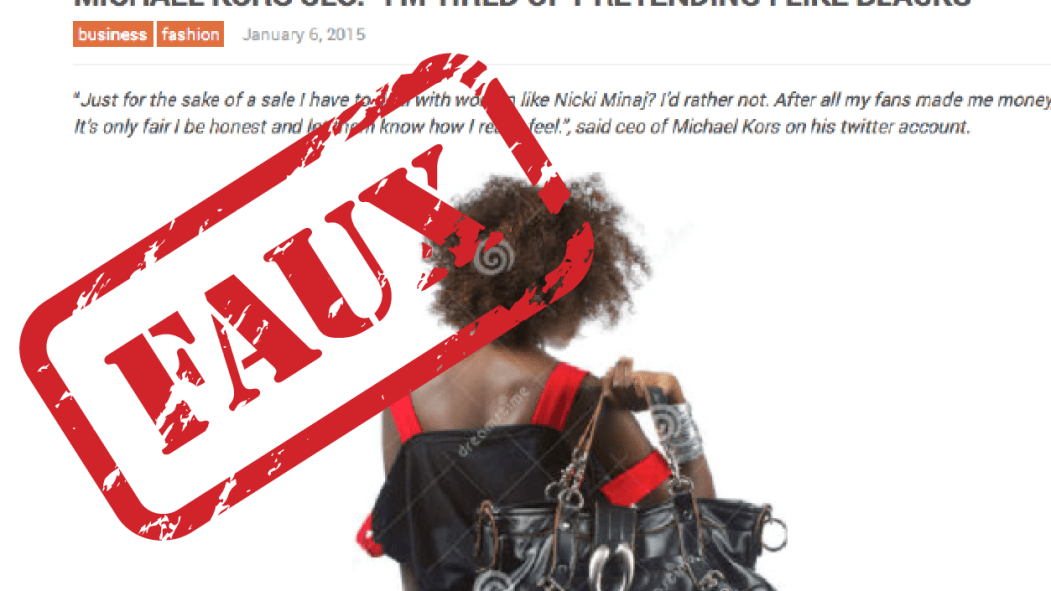 Points bonus: l’article de fausses nouvelles lui-même trempe dans le racisme: «Considérant que tous les Noirs possèdent ou connaissent une personne qui possède une montre, un sac ou un porte-clés griffé Michael Kors, l’annonce affectera sûrement les ventes de la marque», peut-on lire.
