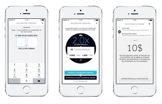 Heureusement, la majoration tarifaire est annoncée à l’avance d’une façon évidente, et lorsque la hausse est supérieure à deux fois, l’usager doit entrer le chiffre manuellement dans l’application afin de montrer qu’il a bien saisi le message. Mieux vaut bien calculer l’impact de la hausse sur le déplacement par contre, car une course de 20$ avec une hausse de quatre fois coûte quand même 80$, soit beaucoup plus qu’avec un taxi régulier. Notons que cette course fictive est d’ailleurs l’exemple donné par Uber dans le courriel envoyé à ses chauffeurs.