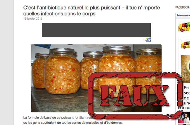 L’article nous offre une recette en titrant «C’est l’antibiotique naturel le plus puissant – il tue n’importe quelles (sic) infections (sic) dans le corps».