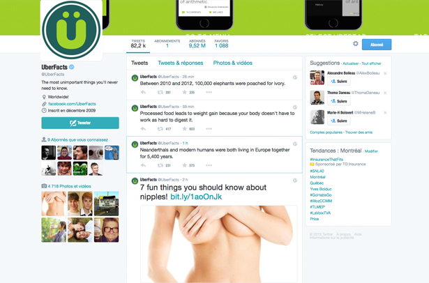 Vous remarquerez que l’inspecteur viral utilise des guillemets lorsqu’il parle des «faits» propagés par UberFacts. Le compte ne mentionne d’ailleurs jamais de source pour ses informations (il serait si facile d’ajouter un lien). Véhiculer des affirmations sans dévoiler de source est un des sept péchés capitaux internet de l’inspecteur viral.